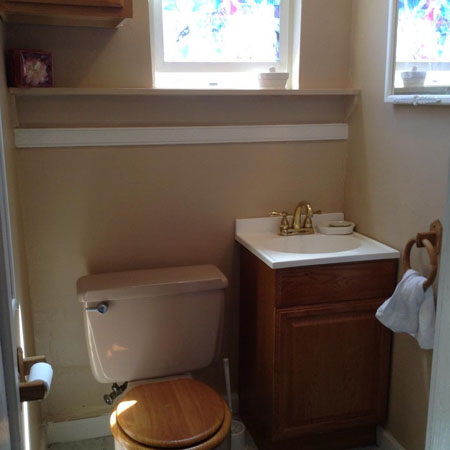 In the European country tradition, the water closet (toilet) and sink are in a separate room from the bath/shower room. |